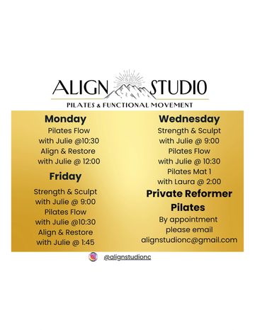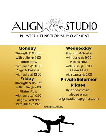A Pilates and Functional Movement Center specializing in Pilates, strength training, functional fitness, barre, pelvic floor rehab and postnatal fitness. We offer private instruction as well as small group classes and workshops. Co-founded by Beth Koppe and Julie Koenig in May 2023. Align Studio is an all inclusive movement collective where every body is welcome.